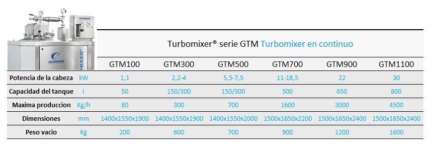 TURBOEMULSOR SERIE GTM PARA LA PREPARACIÓN CONTINUA DE CREMAS LÁCTEAS, CREMAS, BIZCOCHO, CREMAS DE CARNICERO, PASTEL DE PLOMAS, MARSHMALLOWS, MOUSSE Y MUCHO MÁS